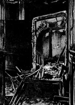 In the following days, Ravachol and Simon built the bomb, Simon conducted a first reconnaissance of the judge's residence at 136 Boulevard Saint-Germain, and then the group of four took the tramway from Saint-Denis to carry out the attack on 11 March 1892.[11] Soubère sat between Simon and Béala and carried the bomb, hiding it under her skirts.[11] She then handed it to Ravachol, who, armed with two loaded pistols, entered the building, placed the bomb on the second floor, the center of the building—since he did not know exactly where Benoît lived.[11] He lit the fuse and fled, while Soubère and Béala would have either stood watch outside[12][13] or she would have gone back to her home.[14] Following the first view, the militant would maybe have remained on-site to observe the aftermath of the explosion as her companions left the area.[15]