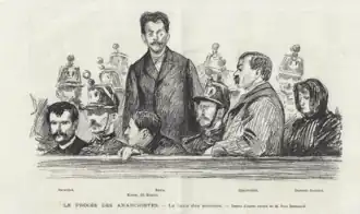 This declaration caused deep alarm among the judges and prompted one of them to abruptly leave the room out of fear.[39] Historian Thierry Lévy regards this event as a clear example of the panic instilled in magistrates by anarchists during that period, following the two attacks targeting them.[39]