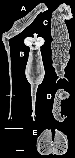 | (A) R. neptunia, lateral view; (B) R. macrura, ventral view; (C) R. tardigrada, dorsal view; (D) R. sordida, lateral view; and (E) trophi of R. tardigrada | |