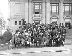 The structure of the Royal Arcanum follows a three tiered system. Local groups are called "Subordinate Councils" or "Councils" which consist of at least 16 members who meet the qualifications of its elective officers.[5] Five Councils in a given state, territory, Canadian province or any two of the same, with at least 1,000 members may petition the Supreme Council for institution as a "Grand Council".[6] The highest authority is the biennial Supreme Council.[7] This basic organizational structure has not changed substantially since the nineteenth century, nor has the group's headquarters moved from Boston.[8][9]