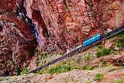 In 1931, the 3 ft (914 mm) narrow gauge incline railway was built to the bottom of the gorge through a narrow cleft just west of the north end of the bridge.[7][18] The first suicide occurred later the same year when a man from Pueblo, Colorado jumped off the bridge.[7] In 1937, a lighting system was installed to illuminate the bridge and the gorge walls.[7]