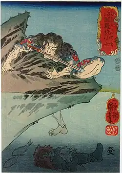 But the authorities soon tracks down essential clues and an arrest party is sent to seize Chao Gai at his house. Chao, Wu Yong, Gongsun Sheng and Liu Tang flees to Shijie village. The Ruan brothers, familiar with the surrounding waters, lures the soldiers who have come for them into the waterways to wipe them out. The seven men then seek refuge in the bandit stronghold of Liangshan Marsh.[1]