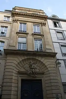 • No. 75: Hôtel de Lannion, at the far end of the plot, built in 1742-1744 for Jean Charles Hocquart, by architect Jean Damun; it is similar to the adjoining hôtel at 78, rue de l'Université, built for the same client. The two hotels face each other through their adjoining gardens. The hotel was initially leased for life to the Count of Lannion, a peer of Brittany. From 1774, it housed many tenants, including the Comte de Vaudreuil, a friend of Queen Marie-Antoinette, from 1782 to 1786. The hotel then belonged to the Daru sisters, whose family owned the hotel bearing their name at 79, rue de Bourbon. The youngest sister, Mme Faget de Baure, rented the hotel to the Countess de Boigne, who held a salon there during the Restoration. Burnt down during the Commune, the main building on the street and the porte cochère were replaced by a building erected in 1898 by Frédéric Honoré. On the garden side, the hotel features a central three-sided rebuilding adorned with four Ionic pilasters on the second floor. The courtyard counterpart was destroyed during the Commune.[43]