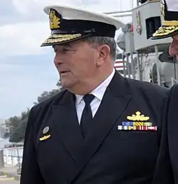 Crane was promoted to vice admiral and succeeded Vice Admiral Russ Shalders as Chief of Navy on 4 July 2008.[7] For his "distinguished service as Deputy Chief of Navy and as Chief of Navy", Crane was appointed an Officer of the Order of Australia in the 2010 Australia Day Honours.[8] In February 2011, the RAN under Crane was embroiled in controversy when the Australian Defence Force was left with a critically reduced amphibious capability.[9] Analysts claimed that a critical naval capability had been allowed to deteriorate to the point of failure.[10]