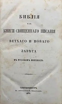 The Russian Synodal Bible (Russian: Синодальный перевод, The Synodal Translation) is a Russian non-Church Slavonic translation of the Bible commonly used by the Russian Orthodox Church, Catholic, as well as Russian Baptists[1] and other Protestant communities in Russia. The translation dates to the period 1813–1875, and the first complete edition was published in 1876. The first edition in modernized orthography appeared in 1956. The first digital edition was prepared by the Moscow Patriarchate in 2000.