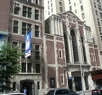 According to the Rutgers Church's official Website, "By 1830… Rutgers had become the largest Presbyterian church in the denomination, with 1,157 members. The old frame church was replaced in 1843 with a large stone structure (still standing and in use as the Roman Catholic Church of St. Teresa)."[2][3] Church records indicate that this building is a hitherto unrecognized work by the important New York architect Minard Lafever, designed at a time when Lafever was transitioning from an architect who specialized in the Greek Revival to one who employed the Gothic Revival for his churches. The congregation subsequently moved into the Lenox Chapel (29th and Madison) in 1863. They razed it in 1873 and built a new church at that location. Fifteen years later, the congregation sold this property and used the proceeds to build a chapel (1888) and church (1890) at the corner of 73rd Street and Broadway—near the Ansonia Hotel.[2]