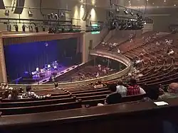 In January 2012 plans were announced to replace the Ryman's 61-year-old stage with one of medium-brown Brazilian teak.[27] The new stage floor, the facility's third, retained an 18-inch lip of its predecessor's blonde oak at its front edge, similar to the way the Ryman stage had been commemorated with an inlaid circle of wood at the new Opry House. The stage's original hickory support beams were reinforced with concrete foundations, crossbeams, and joist work that helped triple the stage's load capacity, ensuring it would remain viable for performances in the decades to come.[27][28]