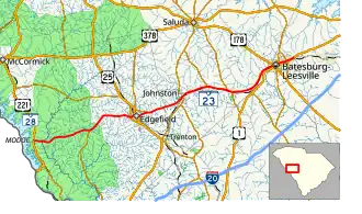 SC 23 is a two-lane rural highway that travels from Modoc, within the Sumter National Forest and near Lake Strom Thurmond, to Batesburg-Leesville. The highway travels through mostly either forest or farmland, while connecting with the city and towns of Edgefield, Johnston, Ward, Ridge Spring and Monetta. Between Monetta and Batesburg-Leesville, SC 23 parallels to the north of US 1.[5]