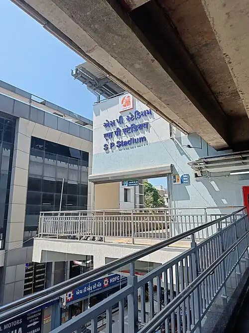 SP Stadium is an elevated metro station on the East-West Corridor of the Blue Line of Ahmedabad Metro in Ahmedabad, India. This metro station consists of the main Sardar Vallabhbhai Patel Stadium, Ahmedabad along with HL College of Commerce and Joggers Park in Navarangpura. This metro station was opened to the public on 30 September 2022.
