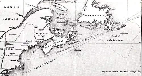 Arctic passed Cape Clear, at the southernmost point of Ireland, early on the morning of September 21, and entered the open Atlantic approaching her maximum speed of 13 knots (15 mph). In settled weather she progressed uneventfully, and early on September 27 had reached the Grand Banks, off the coast of Newfoundland.[26] This area is formed by a series of relatively shallow submarine plateaus forming part of the Canadian continental shelf.[27] Here, the sub-Arctic waters of the Labrador Current meet the warm northbound waters of the Gulf Stream to create weather systems typified by intermittent mists and fog.[28][29] It was the practice for steamers to maintain maximum speeds in these conditions, although before electronic aids to navigation the risk of collision was considerable. Keeping schedules was considered paramount, particularly in the Collins Line where, Alexander Brown states in his 1962 account, "there was no room for overcautious shipmasters".[30] On the morning of September 27, Luce observed typical Grand Banks conditions: "at intervals of a few minutes a very dense fog, followed by being sufficiently clear to see one or two miles."[31]