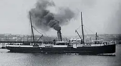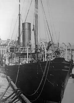 In February 1923 the Fenella collided with the ocean linerClan Cumming in low visibility on the River Mersey, sustaining damage, and was subsequently beached.[31] The Fenella had left Douglas in stormy conditions on Sunday 18 February, with passengers and a cargo of livestock.[31] She arrived at the Prince’s Landing Stage later that night, and discharged her passengers and cargo.[31] Following this she proceeded to anchor in the Mersey, and it was during the course of this manoeuvre that she struck the stem of the Clan Liner, Clan Cumming, and sustained substantial damage to her port quarter.[31] The Clan Cumming was a vessel of 4,804 gross register tons (GRT) and 400 feet (120 m) feet in length.[31] She was lying at anchor in the Mersey at the time of the collision, following which she sustained slight damage to her stem, but was subsequently able to dock.[31] Following the collision a hole was torn in the side of the Fenella,[31] and her Master, Capt. Lee, not knowing the full extent of the damage, took the decision to beach the vessel on the TranmereBight.[31]Fenella’s crew were then taken off by the Dock Board boat, Salvor; however, Capt. Lee stayed with the vessel.[31] The Fenella was inspected by the company’s Marine Superintendent Mr. J. Kelly, who supervised temporary repairs, but the findings were that the damage was considerably worse than at first thought,[32] and the Fenella remained beached at Tranmere until the following Thursday afternoon.[31] She was subsequently floated and taken to the dry dock at Cammell Laird’s for further repairs to be undertaken.[31] Following her dry docking, Fenella had her damage repaired and underwent a substantial overhaul as a result of the collision.[32] According to Lloyd's List,[32] this repair work took six weeks and included renewal of her boliers, cylinders and steam pipes, and the making good to damage sustained to public rooms and accommodation as a consequence of them being immersed in salt water for several days.[32] Damage to the Clan Cumming was comparatively slight; however, she was also taken to a dry dock, where her stem plating was removed, and her twisted stem straightened.[32]Fenella re-entered service on Friday 20 April.[33]