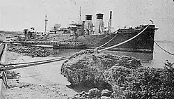 The tug Takelma departed Hawaii on January 6, 1948, towing Jacona to Pusan, Korea.[25] The Russians shut off hydroelectric power to the South Korean Peninsula in May 1948.[26] The floating generator power plant then furnished electricity into the general Korean power grid. On one day in 1950, a rat got into the generator mechanism and short circuited it. Another electrical generator on board the ship automatically came online to compensate for the loss of electricity that was produced by the first generator. This extra load caused the second generator to overheat and it eventually burned itself out. Korea had to restrict their use of electricity, since Jacona's generators were no longer furnishing power at that time.[27]