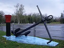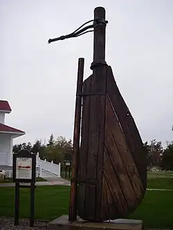 The schooner-barge Michigan was never seen again after the night of 2 October 1901.[1] The wreck of Drake was first discovered by Captain Campbell of Liberty just four days after she sank on 6 October 1901, when he was downbound for the Soo Locks. Captain Campbell reported that Drake was located between Vermilion Point and Whitefish Point lying on her side in 40 feet (12 m) of water with about 5 feet (1.5 m) feet of water over her with a floating spar still strung to the hull.[1] The wreck of Drake lay forgotten on the bottom of Lake Superior for 77 years until she was rediscovered at 46°46.588′N 85°05.933′W / 46.776467°N 85.098883°W in 1978, by the Great Lakes Shipwreck Historical Society (GLSHS)[6] who subsequently illegally removed her rudder, windlass, anchor, and a sign board in the 1980s. Michigan's Antiquities Act of 1980 prohibited the removal of artifacts from shipwrecks on the Great Lakes bottomlands. The Evening News reported a Michigan Department of Natural Resources and Environment 1992 raid on the Great Lakes Shipwreck Museum and its offices that found evidence of 150 artifacts illegally removed from the state-claimed bottomlands, including artifacts from Drake.[7][8][9] Following a settlement agreement with the GLSHS, Drake's rudder, anchor, and windlass are now the property of the State of Michigan.[8][9] The rudder is on loan to the GLSHS for display nearby the Great Lakes Shipwreck Museum and the anchor and windlass is on loan to Whitefish Township for display next to its community building.