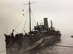On the morning of Saturday 7 June 1924, Peel Castle went aground in Douglas Bay.[3] She had left Liverpool operating the midnight sailing, and had approximately 550 passengers embarked.[3] As she approached Douglas, Peel Castle encountered a bank of fog which forced her to slow her speed.[3] Steaming at minimal speed, Peel Castle continued inbound to Douglas, sounding her whistle continuously, but ran aground on a bank of sand in the middle of Douglas foreshore.[3] The impact was reported to be so slight that passengers were unaware of the situation until members of the ship's company informed them of the development.[3]