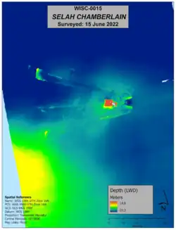 The remains of Selah Chamberlain lie 2 nautical miles (3.7 km; 2.3 mi) northeast of Sheboygan Point in 90 feet (27 m) of water[10][11] within the boundaries of the Wisconsin Shipwreck Coast National Marine Sanctuary.[12] Her wreck is broken into three pieces. Much of her lower hull remains on the site, and her fantail stern is split, exposing her two boilers and her engine. Her wooden floors are reinforced with steel I-beams. Her tandem engine, and its decorated cast iron frame rise 25 feet (8 m) from the bottom of the lake.[13][14]