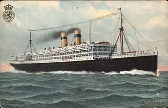Tubantia worked KHL's route between Amsterdam and Buenos Aires. When the First World War broke out in August 1914, she was returning from South America with £500,000 in gold destined for banks in London, much of which for the German Bank of London.[8] She was also carrying about 150 German reservists in steerage and a cargo of grain destined for Germany.[8][9] After she called at Vigo, Spain, the Royal Navy cruiser HMS Highflyer stopped Tubantia, put a boarding party aboard her,[9] and escorted into Plymouth.[8] There, Royal Marines disembarked the German reservists,[9] and the gold was confiscated and taken ashore.[10] Tubantia was released then from Plymouth and allowed to resume her voyage.