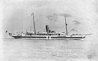 In September 1915 she was requisitioned by the Royal Navy for the duration of World War I, initially as an auxiliary patrol yacht Liberty IV, though soon transformed at Lord Tredegar's expense to a hospital ship, No. 10, HMHS Liberty,[3][8][9] first operating within the North Sea and for much of the time under the command of her owner.[10] She was returned to Lord Tredegar in January 1919.[8][11]