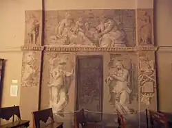 He then decided to leave Rome's corruption and worldliness and between 1515 and 1519 set up home in Faenza, where he became commendatory abbot of the church of Santa Maria Maddalena on Borgo Durbecco - the church is thus still nicknamed the "Chiesa della Commenda" after him. He devoted himself to study, charity and patronage of the arts. He collected books, sculptures and artworks, founded a free public school for poor children and opened a pilgrims' hospice. In 1525 he promised to finance the restoration of the church's monastic buildings as a base for the Knights. In 1533 he commissioned Girolamo da Treviso to decorate the church's main apse with a fresco of The Madonna Enthroned between Saints Mary Magdalene and Catherine of Alexandria. In 1554 he also commissioned a monochrome fresco from Francesco Menzocchi, an artist from Forlì - it showed St Joseph presenting Castiglione himself, now an old man, to the Virgin Mary. He also had his tomb sited under Menzocchi's fresco and wrote the Latin epitaph for the tomb.