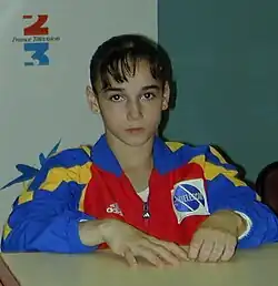 Cojocar was born on 23 October 1985 in Sibiu, Romania. She began gymnastics at the age of three, though she told her coach she was five because she was afraid that he would not accept such a young gymnast.[2] A few years later, she was accepted into the junior national team in Oneşti. After one year, Cojocar was accepted as a member of the senior national team in Deva, under the direct guidance of head coach Octavian Bellu.[2] She made her international debut at the age of fourteen at the 2000 Junior European Championships in Paris, where she won three gold medals (in the all-around,[3] ahead of teammate Silvia Stroescu, and on vault and balance beam) and two silver medals (on floor exercise and with the team).[1] She was touted as the new leader of the young Romanian team and quickly drew international attention, appearing on the cover of the June/July 2000 edition of International Gymnast.[2]