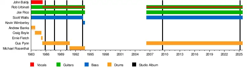 Although the band faced numerous line-up changes, especially in their early days, founding guitarists Urbinati and Rico and bassist Scott Watts recorded every studio album and demo and drummer Gus Pynn played on everything but the Apocalypse Inside demo and CD.