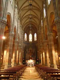 The central nave ends with a deep polygonal apse, enlightened by two orders of ogival windows; in the centre of the apse rises the marble high altar, decorated with gilded bronzes and surmounted by the tabernacle[31] Behind the altar there is the altar piece The Sacred Heart and the Souls of Purgatory, by Giuseppe and Alessandro Catani.[32]
