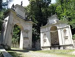 The 10th chapel, beyond the St Ambrose arch, and Santa Maria del Monte atop the mountain | |