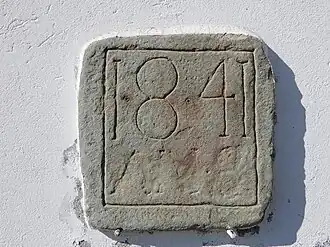 The bell tower features a stone bearing the year 1841. To the right of it lies the old cemetery, where there is a stone cross with the inscription: "Ici reposent nos ancêtres" (in French, Here lie our ancestors).[1]