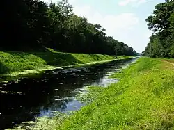 Chapter 700 of the Acts of 1913 created the Salem and Beverly Water Supply Board and gave it the right to divert Ipswich River flows over 20 million gallons per day, up to 2500 million gallons per year, in December through May, at a certain location in Topsfield (approximately the mouth of the canal).[1] In 1917 a canal was excavated from the Ipswich River through Wenham Swamp to a pumping station in Wenham, where it was pumped up to nearby Wenham Lake, a reservoir. The board declined construction of artificial impoundments on the river or canal as unfeasible.[2] In fact, in times of high water, three channels in the bank of the modern canal allow water to flow freely into or out of the swamp, which is part of the Ipswich River wetlands.