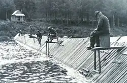 In 1928, in an attempt to measure the escapement of salmon in Southeast Alaska, the United States Bureau of Fisheries constructed four special weirs designed so the passing salmon could be counted (photo below). Escapement is the proportion of spawning stock that survives fishing pressure during a salmon run. The counting stations were intended to provide harvest managers with data they needed to manage the salmon fisheries, but they missed much of the escapement. Smaller fish passed through the weirs uncounted, the salmon could not be counted during times of flood, and hundreds of other salmon streams in the area were without counting stations.[9]