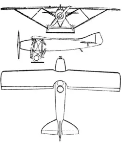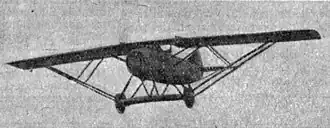 It was noted at the time that the wings were very thin and so required elaborate struttage which also involved the fixed landing gear. The central part of the latter was a wooden airfoil section, 3 m (9 ft 10 in) span plane which contributed an extra 13% lifting area. This had metal carriers at its tips, each supported by a pair of almost parallel struts to the lower fuselage. Split axles, mounted centrally on a transverse V-strut from the fuselage, were connected to the carriers via rubber shock absorbers and mounted the wheels. The main wing struts converged slightly from the carriers to the wing longerons at about 80% span. From near the midpoint of these struts a further pair of inverted Vs braced the inner wing to the upper fuselage.[4]