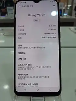 The Galaxy A20 is available under different model numbers such as SM-A205F and SM-A205G. In South Korea, it is marketed as the Galaxy Wide 4.[2]
