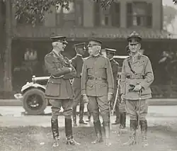 In early 1917, shortly before the American entry into World War I, the army was preparing for its involvement in the war raging in Europe on the Western Front, and all academy instructors who could be detailed were assigned to field commands. This left an understrength USMA teaching staff not only doing "double duty," but also teaching in officer training schools during the summer.[25] When Colonel Tillman was recalled from retirement to serve as USMA superintendent in June, 1917,[5] the cadet class of 1917 had already graduated two months early and been assigned to wartime posts. The USMA class of 1918 graduated in the Autumn of 1917, the classes of 1919 and 1920 graduated in June 1918, and the cadet class of 1921 were graduated before the Armistice with Germany was signed. "On November 2, 1918, the Corps of Cadets consisted of members of the Fourth Class only."[25] Tillman had seen the graduation of an entire corps of cadets before he was again retired, this time with promotion to brigadier general and the Army Distinguished Service Medal for his wartime service.[5] The citation for his Army DSM reads: