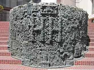 The cylinder-shaped sculpture, which serves as the outer wall of the fountain basin, features bas-relief scenes of San Francisco, "whimsically interrelated".[1] It measures approximately 90 inches (2.3 m) tall, with a diameter of 193 inches (4.9 m), and is set into a base of brick stairs. Albert Lanier served as the architect; credited assistants include Aiko Asawa, Haru Awara, Mae Lee, Mei Mei, Hector Villanueva, and Sally Woodbridge.[1]
