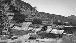 Construction on the dam included pouring concrete into blocks measuring 5 by 50 feet (1.5 by 15.2 m) and incorporating a 275 ft (84 m) wide uncontrolled ogee-type spillway on the dam's downstream face. The outlet works, which release water for municipal use, connected the reservoir intake on the upstream side of the crest with San Vicente Pipelines 1 and 2 via three cast-iron pipes 36 inches (910 mm) in diameter.[3] In 1944, the San Diego County Water Authority (SDCWA) was formed and would soon begin construction on an aqueduct from the Colorado River Aqueduct called the San Diego Aqueduct to supply projected future water needs. Construction on San Vicente Dam was completed in 1943 but construction on the First San Diego Aqueduct, which was supplied by the Colorado River Aqueduct, did not begin until 1945. It was not until 1947 that the First Aqueduct was complete and San Vicente Reservoir began to receive its water.[6][8]