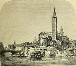The beginning of its construction dates back to 1260, when the Dominican friars, who lived outside the walls of the city, received from the Bishop of Verona, Manfredo Roberti, the land on which to build the new church and convent. The construction of the great building began in 1290 and it took a very long time: it can be said that it was finished only in the 1440s, although the basic structures were already finished in the third decade of the previous century.[4] The basilica was consecrated on October 22, 1471 by Cardinal and Bishop of Verona Giovanni Michiel, but minor works continued for more than two centuries, never reaching the completion of the main elevation.[5] When the Dominican Order was suppressed in 1807, the temple was entrusted to the secular clergy, while the adjacent convent, now abandoned, later became the site of the Istituto Maffei.
