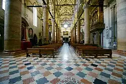 The floor is still the original one, supposedly made by Pietro da Porlezza in 1462. It is made of marble in three colors: white Istrian, black basanite, recalling the robes of the Dominicans,[47] and red, recalling that the church is dedicated to St. Peter the Martyr of Verona.[31] The most elaborate parts are found in the nave and the transept, and in the center of the latter there is a rose window with the black and white rayed shield, the symbol of the Order. Neither the ancient chapels nor the sacristy show any traces of the ancient floor.[32] Also traditionally attributed to da Porlezza is the red Veronese marble stoup located near the side entrance.[31]