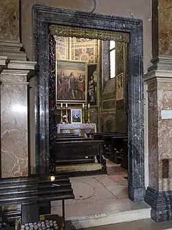 Continuing toward the chancel is the sixth altar. It was made in 1573 on the commission of the nobleman Gasparo Verità. With classical forms reminiscent of the work of the famous Veronese Renaissance architect Michele Sanmicheli, it houses an altarpiece, made by Bernardino India late in his life, depicting the Wedding of St. Catherine.[48]