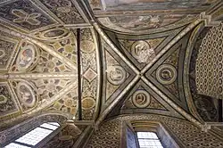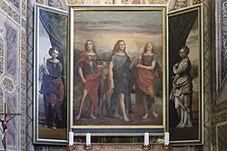Most of the left wall of the chapel is, however, decorated by the later fresco cycles painted by Giovan Francesco Caroto around 1508 in which he depicted on two overlapping sections Stories of Tobias and Stories of the Archangel Raphael. In the top register, Tobias bids farewell to his father; in the next, he eviscerates a fish (heart, brain and gall) at the Archangel's suggestion with the purpose of obtaining medicines from it; in the last, he returns to his father with his young wife and cures his adored parent from blindness with medicines obtained from the fish. Caroto's intervention extends into the vault of the chapel where sumptuous ornamentation remains, and in the center of the four segments are placed four roundels with busts of the evangelists. Giovan Francesco was also the author of the chapel's altarpiece, now preserved at the Castelvecchio Civic Museum and replaced on site by a 1934 copy by Gaetano Miolato, in which in the central triptych the painter intended to depict the Three Archangels (Michael, Raphael, Gabriel). The attribution of this work is certain and the author signed it with “F. CAROTUS P.,” whereas the attribution of two doors of the triptych, still preserved in the chapel, is more uncertain, which some critics instead would assign to his brother Giovanni Caroto. On them are depicted Saint Apollonia and Saint Lucia.[58][61][62]