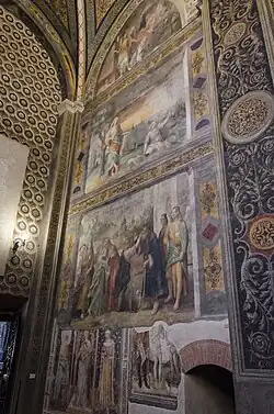 Originally, the walls of the church's vast chancel must have been almost entirely covered with frescoes from the late 14th and early 15th centuries; only fragments of these paintings survive today, rediscovered since the second half of the 19th century. For example, on the right wall can be seen some remnants, largely hidden by a large 18th-century canvas, of a large fresco depicting a Last Judgment by Martino da Verona.[56] Of this painting, the best-preserved part, thanks in part to a restoration carried out in 1958, is a left vertical band in which angels, blessed and resurrected are depicted. The 18th-century canvas, on the other hand, is by Paolo Pannelli in which he intended to depict the Martyrdom of seven Augustinian saints.[56]