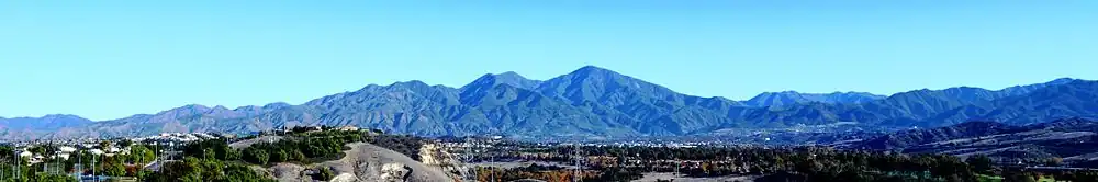 The range starts in the north at the Whittier Fault and Santa Ana Canyon, through which the Santa Ana River flows. To the north of the canyon are the smaller Chino Hills in Los Angeles and San Bernardino counties.[1] The northernmost summit of the Santa Anas, at 3,045 feet (928 m), is Sierra Peak. From there, the major summits are Pleasants Peak, 4,007 feet (1,221 m); Bedford Peak, 3,800 feet (1,200 m); and Bald Peak, 3,947 feet (1,203 m). The next two peaks — Modjeska, 5,496 feet (1,675 m); and Santiago, 5,689 feet (1,734 m),[3] the highest summit in the range — form Saddleback Ridge. Saddleback, located approximately 20 mi (32 km) east of Santa Ana, is visible from much of Southern California.