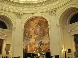 The pavement mosaic was designed by Bernini with the Chigi heraldic symbol in the center; the stone was replaced in 1956, changing from brick and Peperino stone to two colors of marble. The cupola of the dome was decorated by Bernini's studio, but at the base the Angels that sustain the garlands were sculpted by Antonio Raggi.[1] The apse was frescoed with an Assumption of the Madonna. The church has six lateral altars. On the left, the altarpieces are: