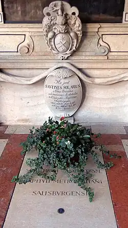 In 1612, he was appointed chief architect of Salzburg by the archbishop Markus Sittikus. His work introduced Lombard early baroque to Austria. Solari died in Salzburg and is buried in the Petersfriedhof Salzburg there.