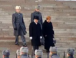 In 2005, Niinistö met Jenni Haukio, who at the time worked for the National Coalition Party and interviewed Niinistö for the Nykypäivä magazine.[61] They later became romantically involved but kept the relationship secret from the public until the wedding on 3 January 2009.[62] In October 2017, the couple announced that they were expecting a child, and they subsequently had a son, who was born in February 2018.[63][64][65] In 2017 Niinistö and Haukio's dog Lennu went viral across the world.[66][67]