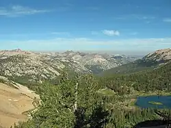 Land cover types in the Sawtooth Wilderness include pine and spruce-fir forests, meadows, and alpine tundra. Lodgepole pine forms nearly monotypic forests in lower elevations of the wilderness, while douglas fir and quaking aspen can also be found. Higher elevations contain whitebark pine, Engelmann spruce, subalpine fir, and limber pine.[26][27] There are no known threatened or endangered plant species in the wilderness.[12]