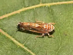 Scaphoideus titanus, the American grapevine leafhopper, is an insect of the leafhopper family (Cicadellidae) which feeds on various plants of the family Vitaceae. Native to North America, it was introduced by accident to Europe where it has become a pest by acting as a vector of the grapevine phytoplasma disease flavescence dorée.[1] Mating requires species-specific vibrational patterns that males emit to the females, which are often victim to reproductive interference, including vibrational mating disruption caused by humans for pest control purposes.[2] Nymphs do not engage in vibrational communication.[3]