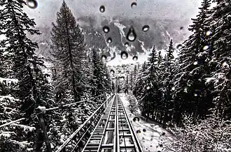 The Schatzalp-Bahn is a funicular railway in Davos, Switzerland. The line leads from Davos-Platz at 1,557 m (5,108 ft)[1] to Schatzalp at 1,861 m (6,106 ft).[1] It has a length of 712 m (2,336 ft)[1] at a maximum inclination of 47%[1] with a difference of elevation of 304 m (997 ft).[1] The funicular has two cars on a single track with a passing loop. It provides access to Schatzalp and Strela skiing area.[2]