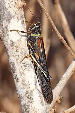 The large painted locust[1] (Schistocerca melanocera) is a species of bird grasshopper endemic to the Galapagos Islands of Ecuador, except Española Island. The species forms a large part of the diet of the Galápagos hawk and lava lizards. It can grow up to 8 cm long.[1]