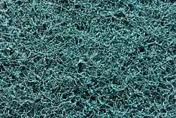 The structure of Scotch-Brite pads is created by a sparse unwoven polymer such as cellulose, nylon or spun polypropylene fiber. Products use several variations of hardening and abrasive materials, such as aluminum oxide (alumina), titanium dioxide and resins.[1] Although the base polymers may be considered benignly soft, the composition with other materials greatly enhances their abrasive powers; to the extent that a heavy-duty Scotch-Brite pad (which contains both aluminum oxide and titanium dioxide) will scratch glass.