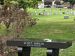 By 1916, Joplin had developed tertiary syphilis,[50][51] but more specifically it was likely neurosyphilis. On February 2, 1917, he was admitted to Manhattan State Hospital, a mental institution.[52] The "King of Ragtime" died there on April 1 of syphilitic dementia at the age of 48[46][53] and was buried in a pauper's grave that remained unmarked for 57 years. His grave, located at St. Michael's Cemetery in East Elmhurst was finally given a marker in 1974, the year The Sting, which showcased his music, won Best Picture at the Oscars.[54]