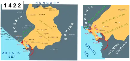 Lazarević and his Serbian Despotate had been ceded Lordship of Zeta from Balsha III in April 1421, but the Venetians did not recognize him, holding on to the occupied Zetan coast and Bojana, including Drisht recaptured by them after Balsha's death.[6] Venetians emphasized to the despot's envoy that they had no intention to cede Balsha's former possessions to the despot and even requested Ottoman support in case of the despot's attack.[7] In August 1421, Lazarević led his army into Zeta. Gjon Kastrioti, who was a Serbian ally,[8] reinforced Lazarević with troops led by one of his sons immediately upon the arrival of the latter in Zeta.[9][10] According to Fan Noli it was Stanisha who was sent by his father, together with auxiliary forces, to help the Serbian despot to capture Shkodër from the Venetians.[11] With their support, the despot immediately captured Shirgj and Drisht. Then he went to the coast and took Bar in the middle of November 1421.